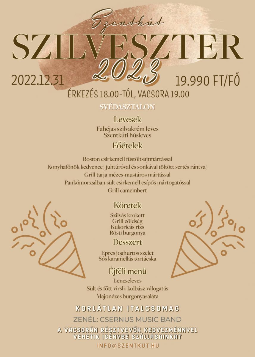 A részvételi díj 19.900 Ft/fő, amely tartalmazza a svédasztalos vacsorát, bőséges választékkal, az éjféli menüt és korlátlan italcsomagot.